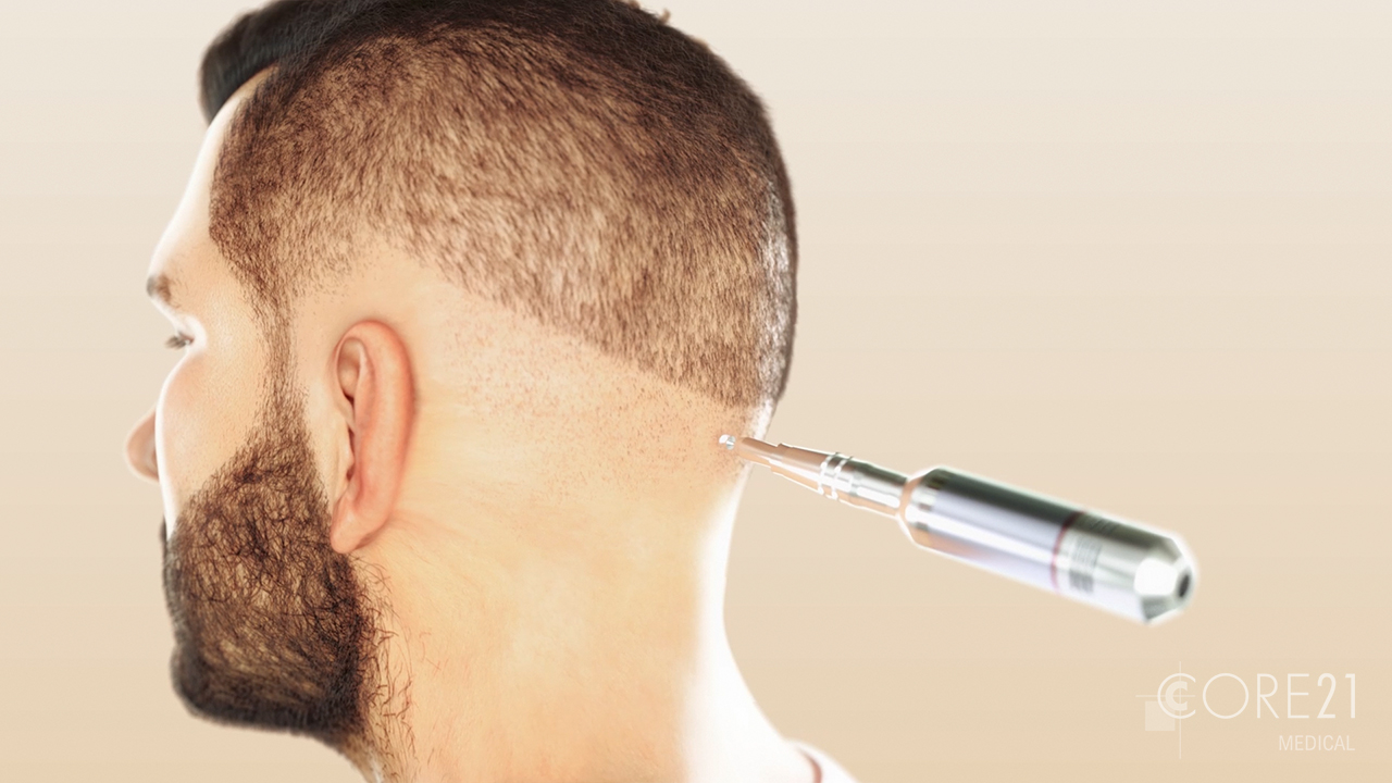 Die 3D-Animation zeigt den Ablauf einer Haartransplantation. Das 3D-Modell des Kopfes wurde dabei an das Aussehen des Protagonisten aus dem Imagefilm des Kunden angepasst.
