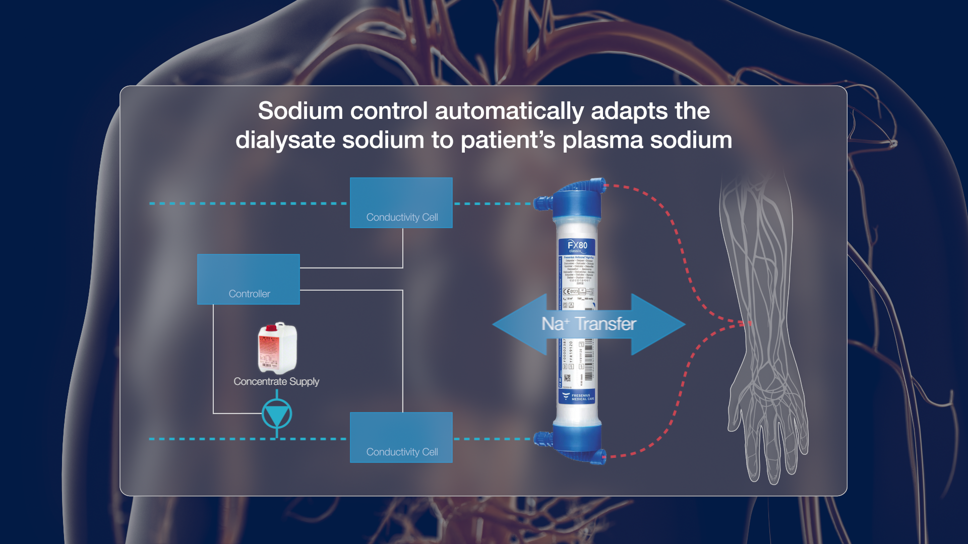 Ein wichtiges Ziel der Dialysetherapie ist es, die interdialytische Nahrungsaufnahme und die intradialytische Natriumentfernung im Gleichgewicht zu halten. Welche Natriumkonzentration im Dialysat optimal ist, kann jedoch von einem Hämodialysepatienten zum anderen ganz unterschiedlich sein. Beim individualisierten Sodium Management wird die prädialytische Natriumkonzentration im Plasma automatisch ermittelt. Die Natrium-Regelung passt das Dialysatnatrium von selbst an das Plasmanatrium des Patienten an.
